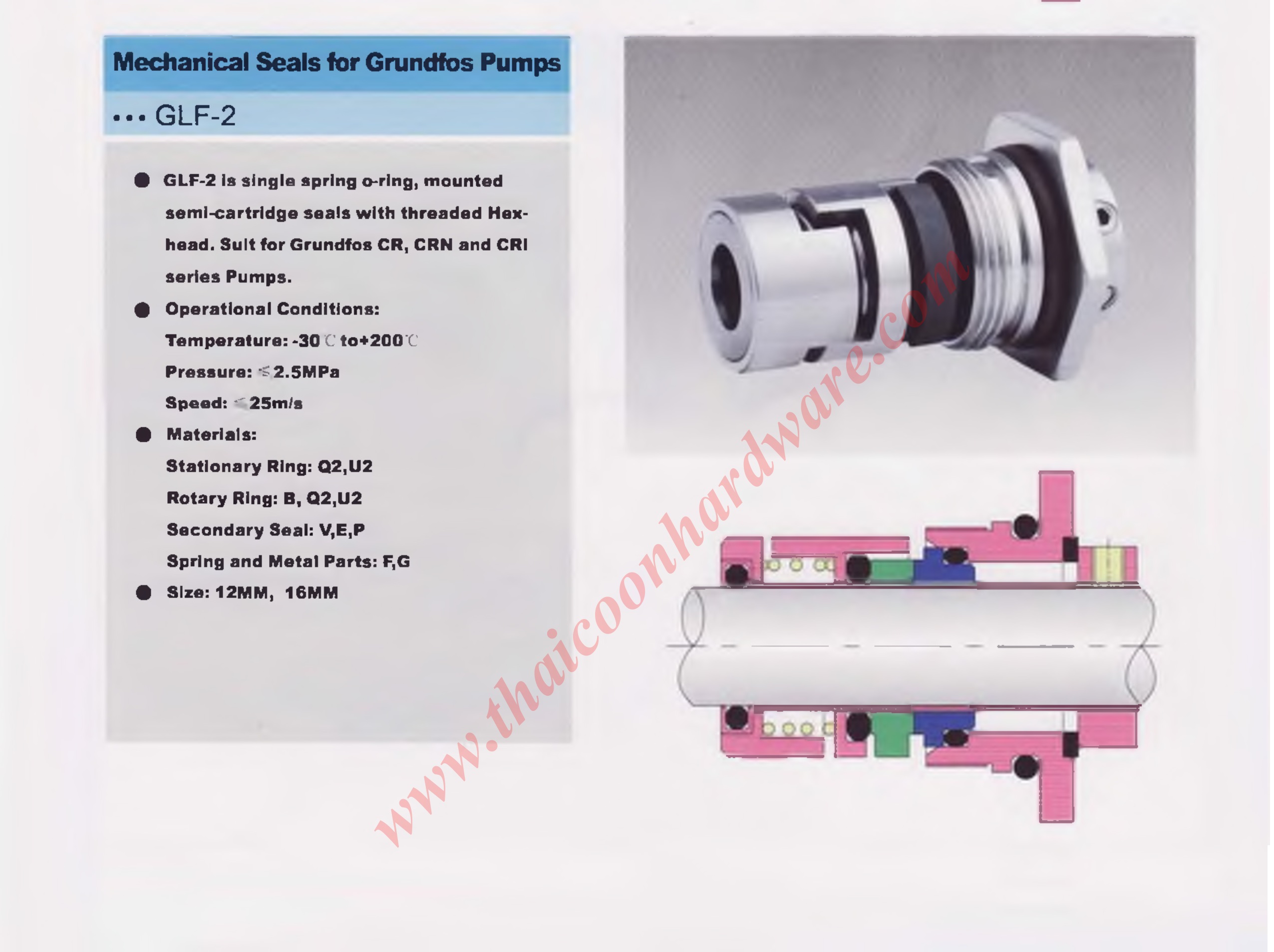 GLF-2 is single spring o-ring, mounted semi-cartridge seals with threaded Hex-head, Suit for Grundfos CR, CRN and CRI series Pumps